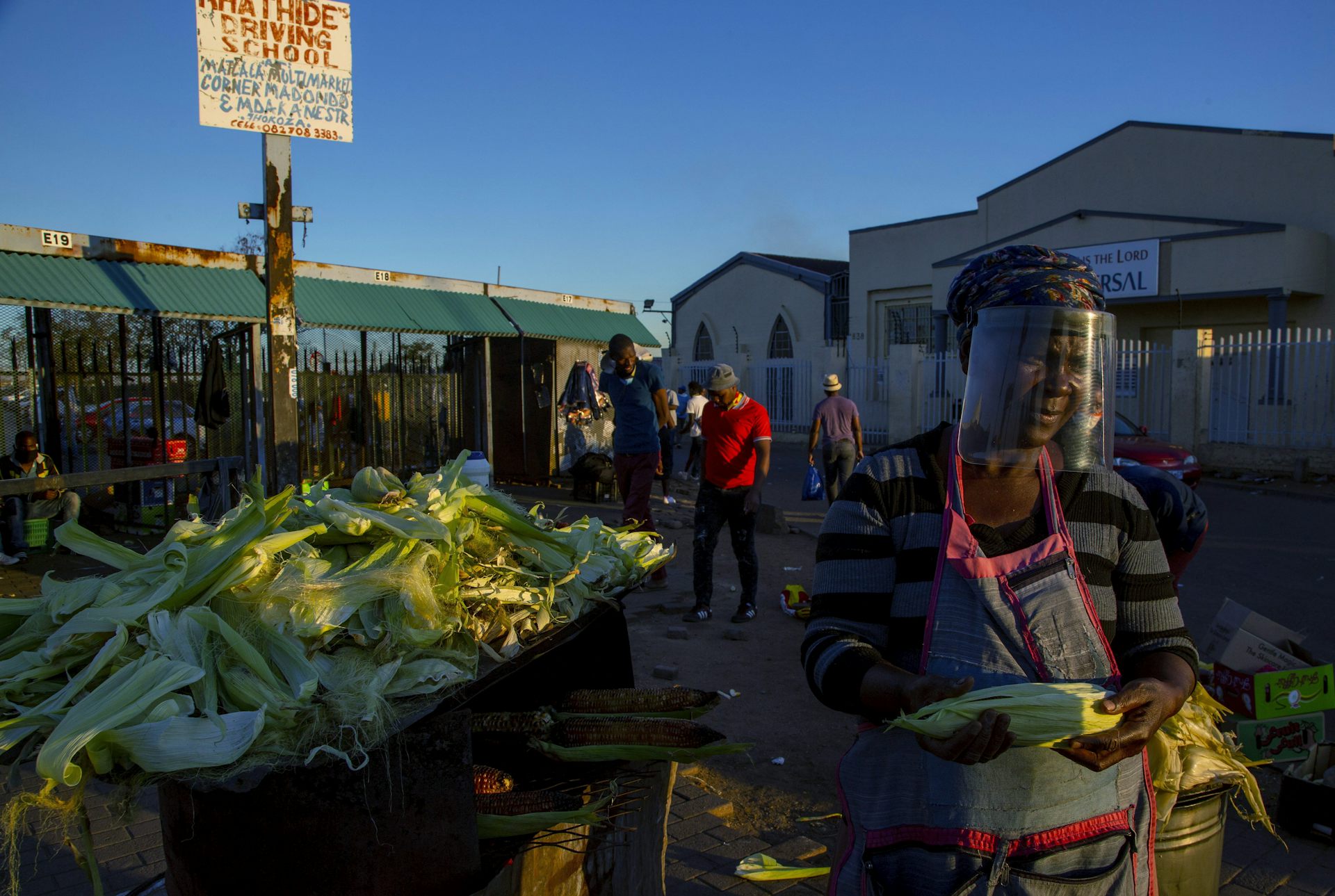 Gogo Zitha, portant un écran facial protecteur pour se prémunir contre la propagation du nouveau coronavirus, vend du maïs grillé au coin de la rue à Katlehong, à l'est de Johannesburg, en Afrique du Sud, le mercredi 6 mai 2020. L'Afrique du Sud a commencé à assouplir progressivement ses mesures strictes de confinement le 1er mai, alors que les cas confirmés de Covid-19 continuent d'augmenter.