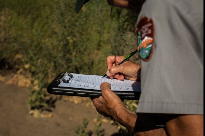 Collecting data on invasive plants, Santa Monica Mountains National Recreation Area, California.