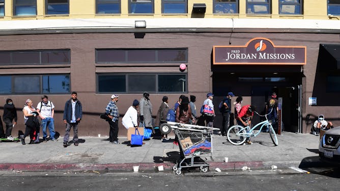People wait in line for a free morning meal in Los Angeles in April 2020. High and rising inequality is one reason the U.S. ranks badly on some international measures of development.