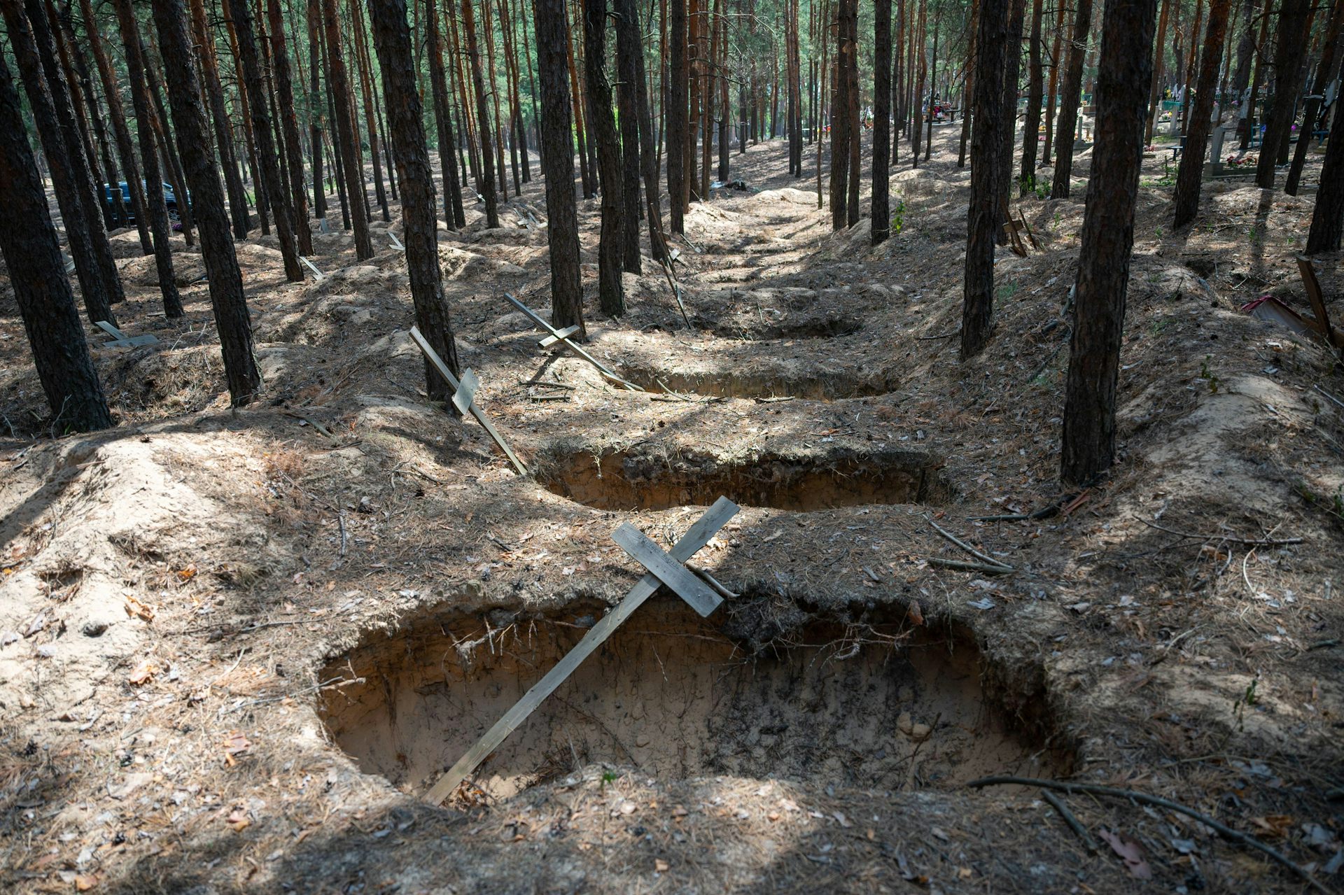 Crosses mark graves at a mass burial site in a forest on the outskirts of the city of Izium, Ukraine, on July 27, 2024.