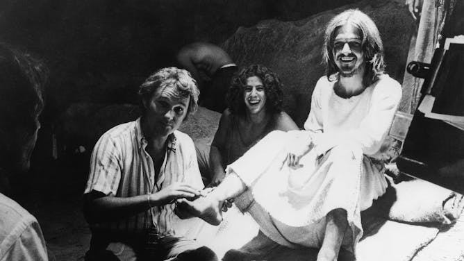 Producer-director Norman Jewison, left, demonstrates how he wants an actor to wash the feet of Jesus, portrayed by Ted Neeley, during filming of the movie version of the rock musical, ‘Jesus Christ Superstar,’ in October 1972.
