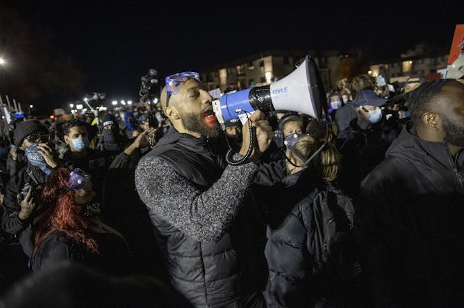 Former NBA player Royce White addresses a crowd after the fatal police shooting of Daunte Wright in April 2021.