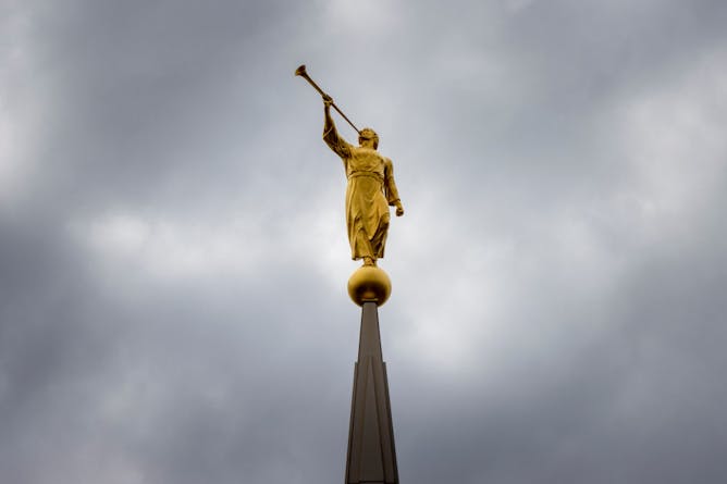 A golden sculpture of the angel Moroni atop the temple of the Church of Jesus Christ of Latter-day Saints in Rexburg, Idaho.