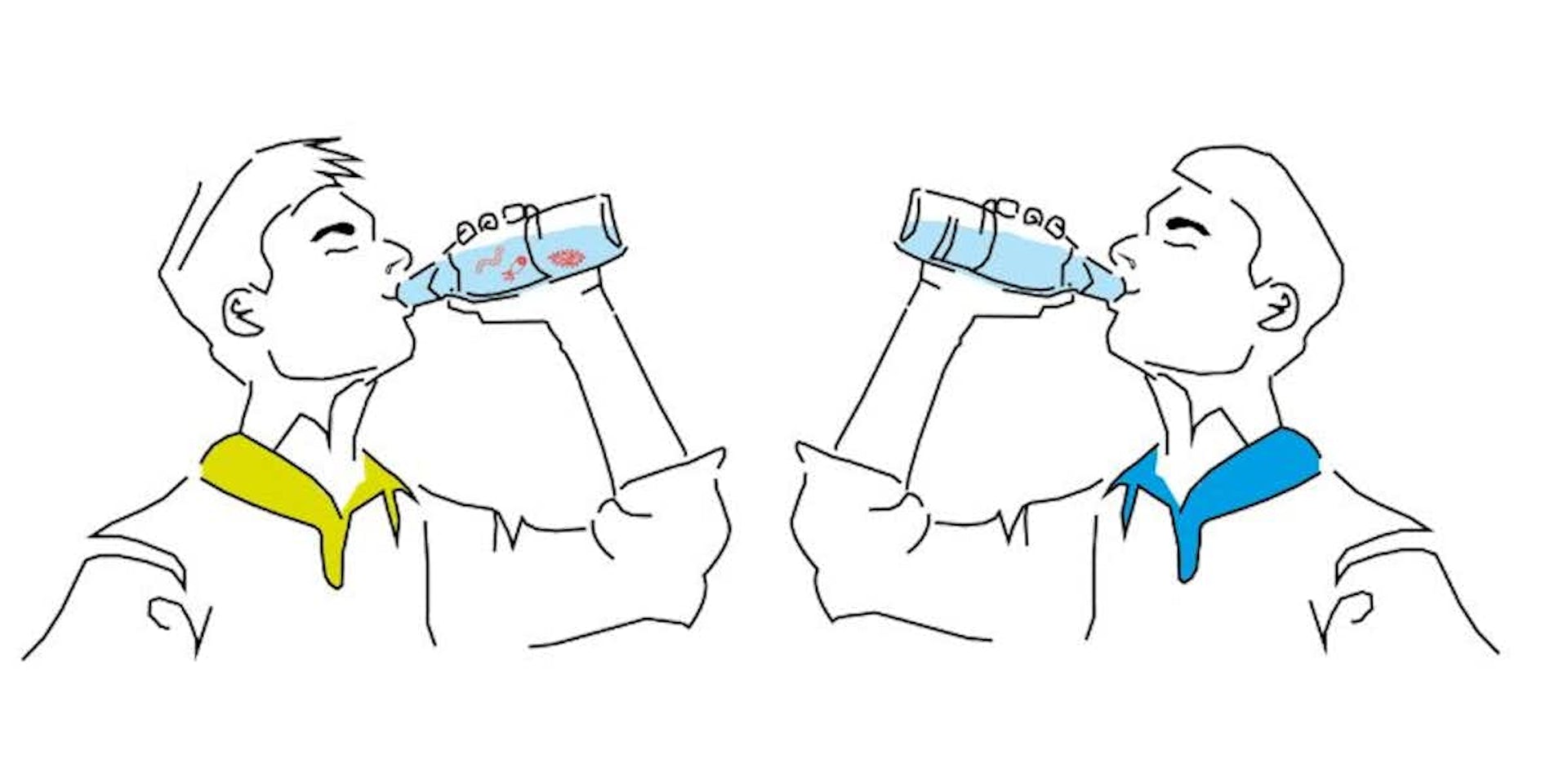 Ilustrasi orang yang mengkonsumsi air yang tercemar dan yang aman.