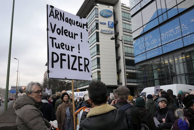 Un manifestant tient une pancarte sur laquelle on peut lire «ARNaqueur, voleur, tueur, Pfizer» lors d'une manifestation contre le pass vaccinal et le vaccin contre la Covid-19 devant le siège de Pfizer, à Paris en janvier 2022.