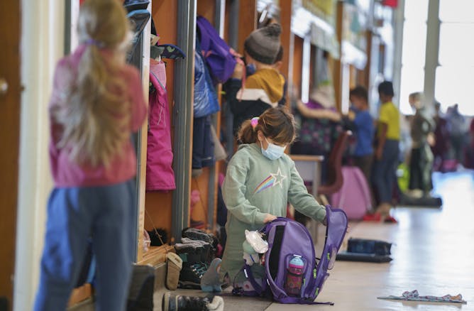 Des élèves d'une école primaire se préparent à entrer en classe à Montréal en janvier 2022.