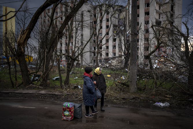 Des femmes attendent d'être évacués, après la destruction par l'artillerie de leur habitation, le 21 avril 2022. L’invasion russe de l’Ukraine par la Russie a été un réveil brutal pour les défenseurs du libéralisme.