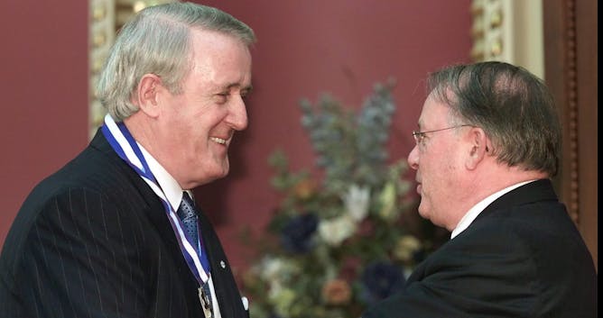 L'ancien premier ministre Brian Mulroney reçoit l'Ordre national du Québec des mains du premier ministre du Québec Bernard Landry, en mai 2002, lors d'une cérémonie au Parlement du Québec.