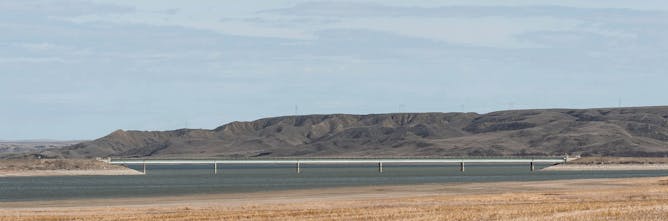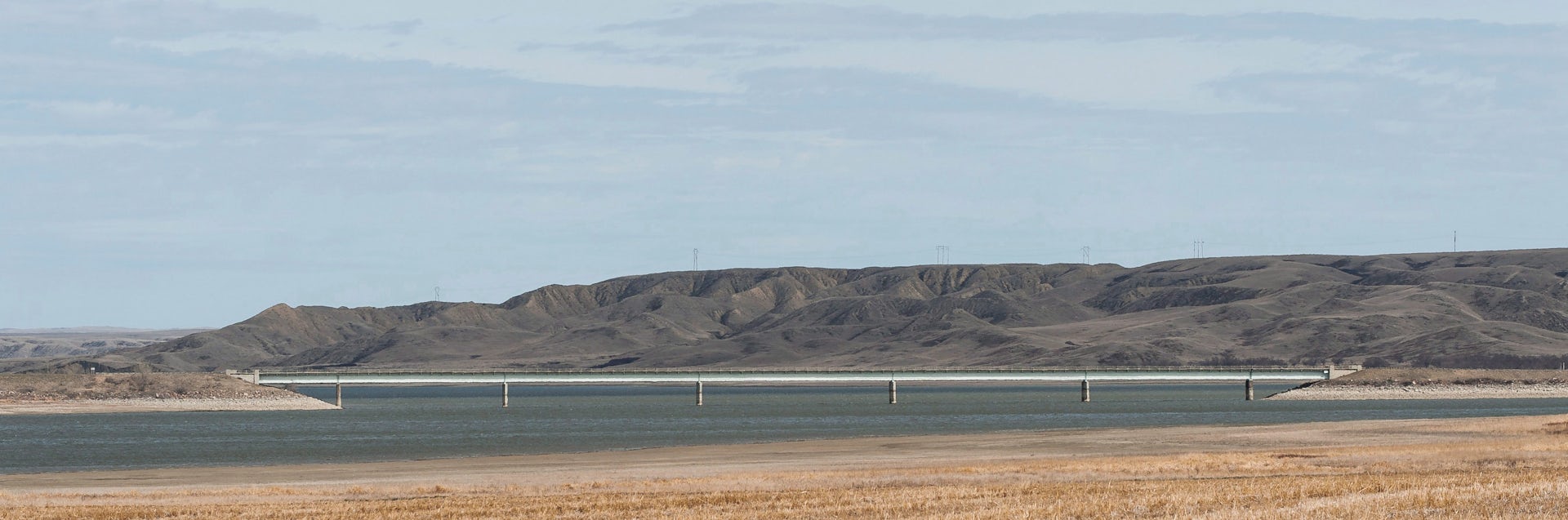 Highway 4 crosses Lake Diefenbaker at Saskatchewan Landing Provincial Park. Lake Diefenbaker is a part of the South Saskatchewan river basin which faces unprecedented levels of reduced water flows in 2024.