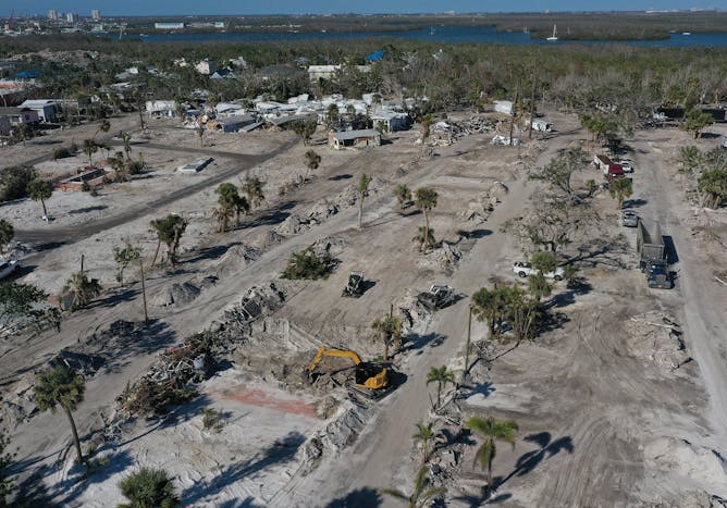 Crews clear lots of destroyed homes in Fort Myers Beach, Fla., in February 2022, four months after Hurricane Ian.