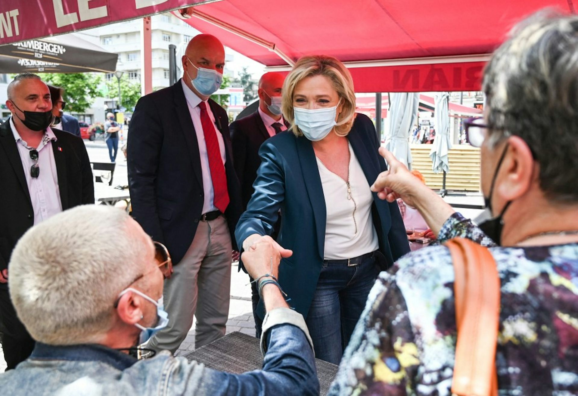 Marine Le Pen (RN) à Saint-Chamond le 3 juin dans la région Auvergne Rhone Alpes, dans le cadre de la campagne pour les élections régionales.