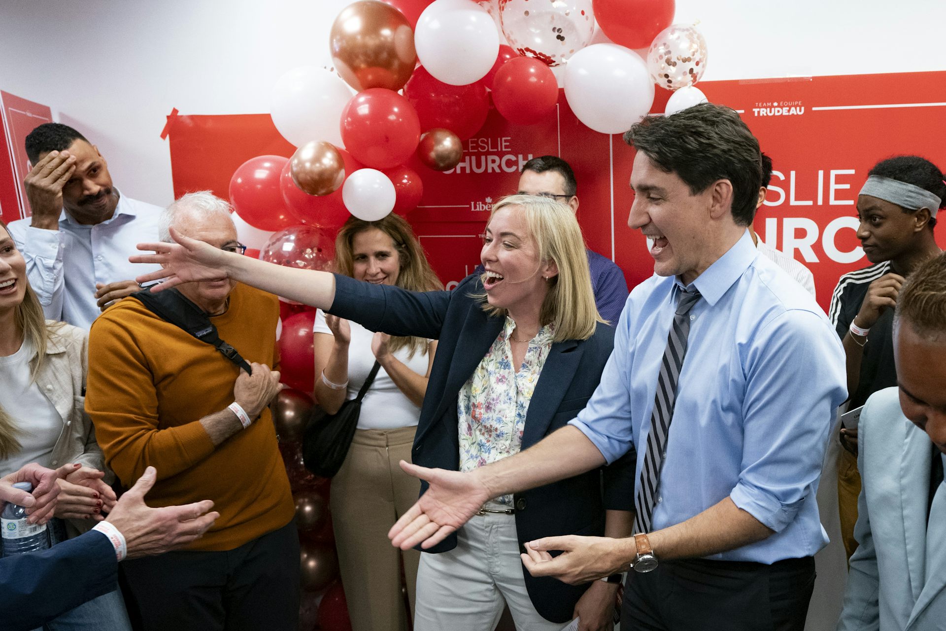 Leslie Church, the Liberal candidate for Toronto-St. Paul’s, and Prime Minister Justin Trudeau greet supporters at a campaign volunteer event in Toronto in May 2024.