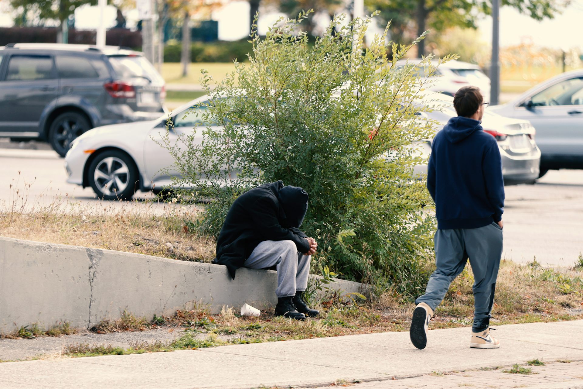 A man walks past a person huddled on a curb in Barrie, Ont., in 2023. Canadians are growing increasingly pessimistic about the economy and finances.