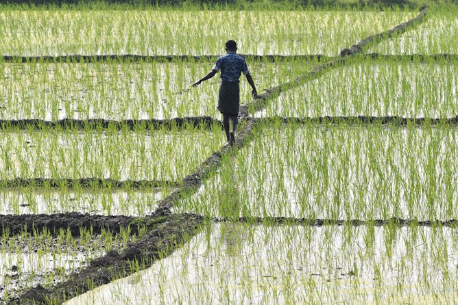 A farmer walks through a rice paddy in India’s northeastern state of Assam.