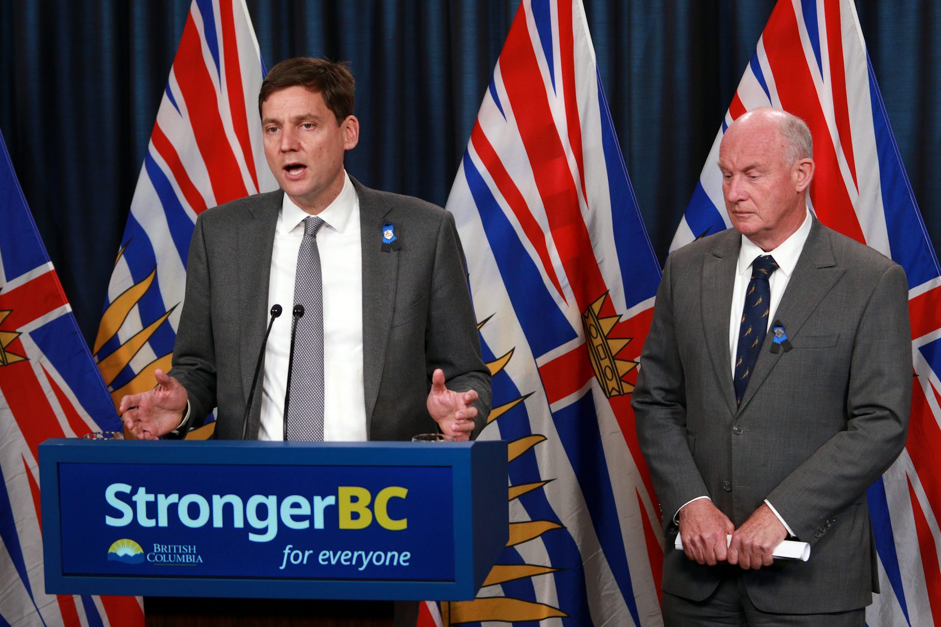 Premier David Eby, joined by Minister of Public Safety and Solicitor General Mike Farnworth, announce that the B.C. government is banning the use of hard drugs in public places, part of the province’s ongoing decriminalization pilot project, at a press conference in Victoria on Oct. 5, 2023.