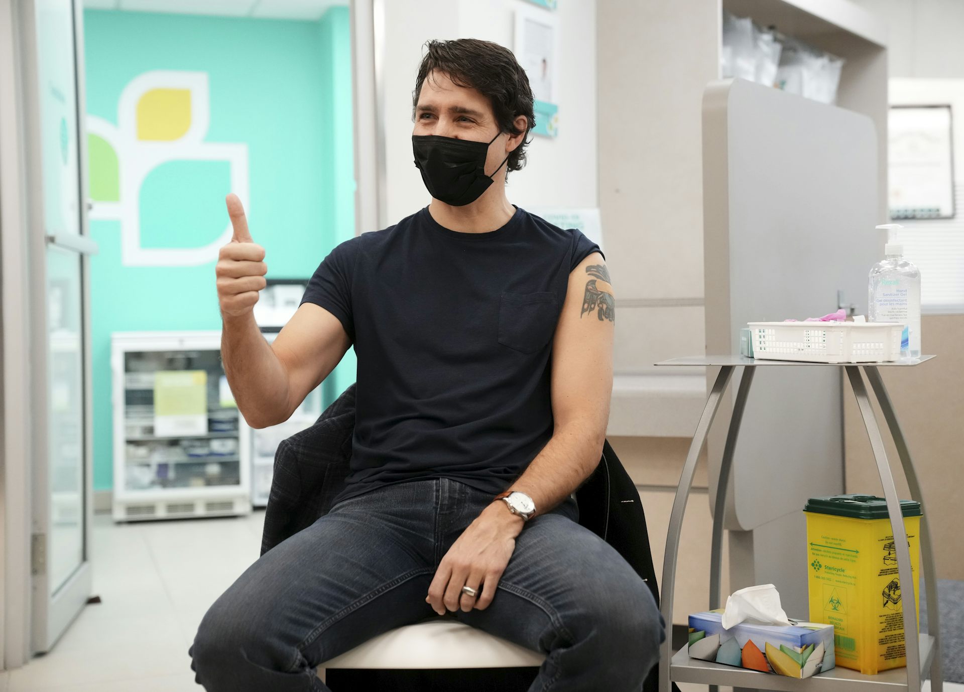 Prime Minister Justin Trudeau gives a thumbs up signal after receiving his COVID-19 vaccine booster shot at a pharmacy in Ottawa on Jan. 4, 2022.