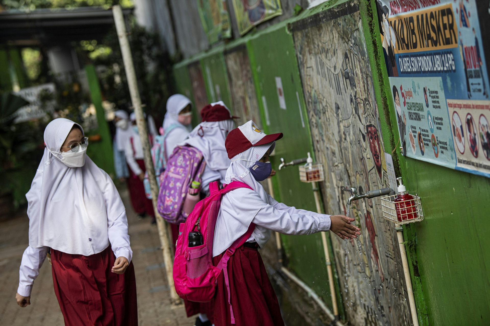 Siswa mencuci tangan setelah ikut pembelajaran tatap muka di SDN Pondok Labu 14 Pagi, Jakarta Selatan, 30 Agustus 2021.