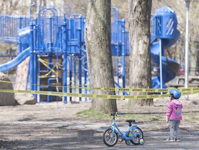 A young child stands outside the entrance to a playground in Montréal on May 3, 2020, as the COVID-19 pandemic continues in Canada and around the world.
