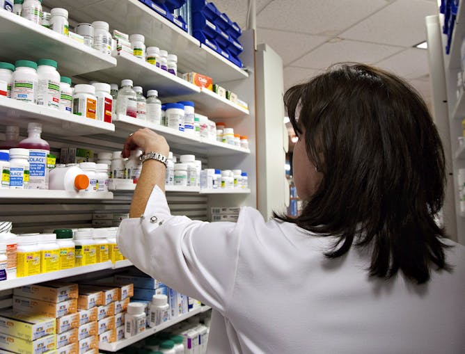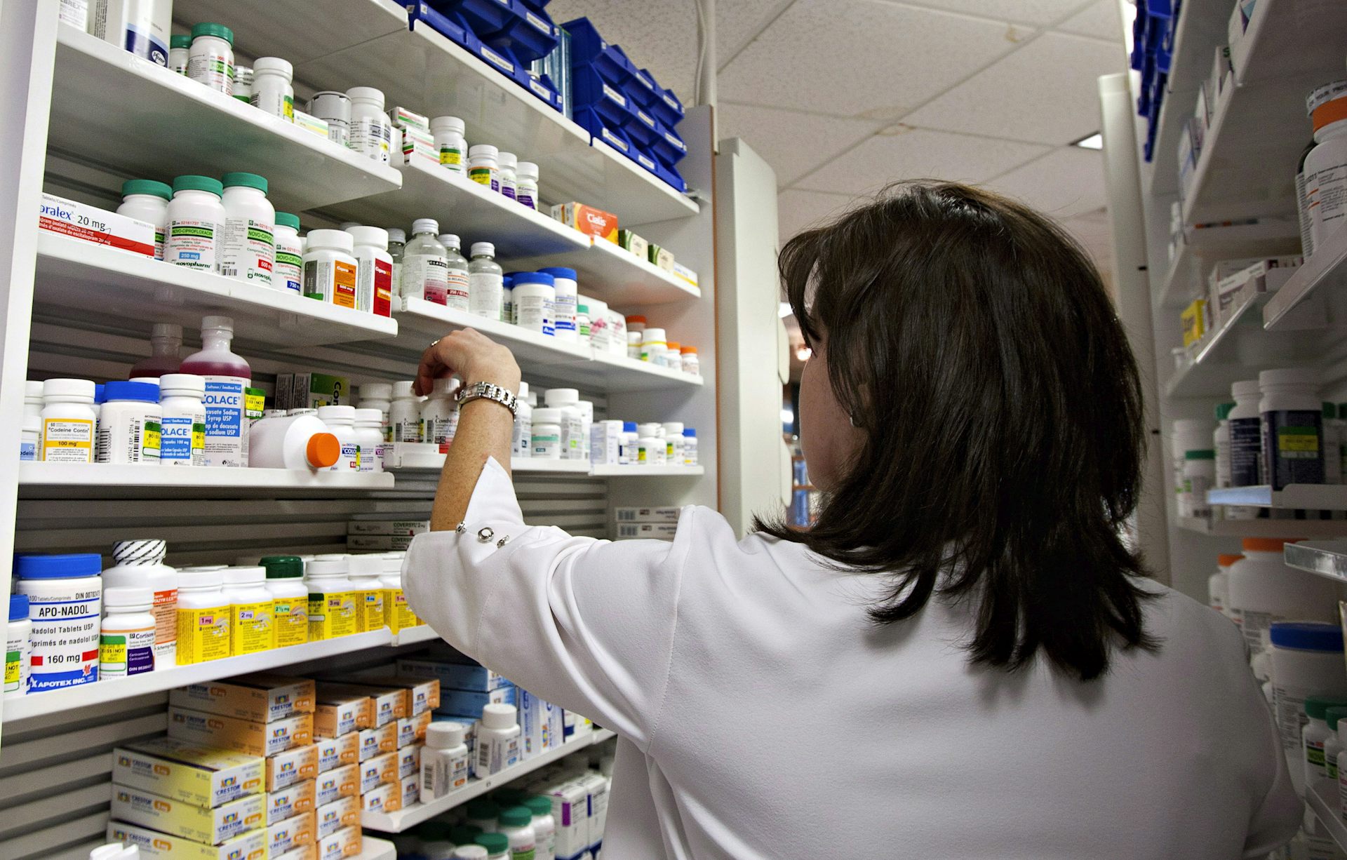 A lab technician prepares a prescription at a pharmacy in Quebec City on March 8, 2020.