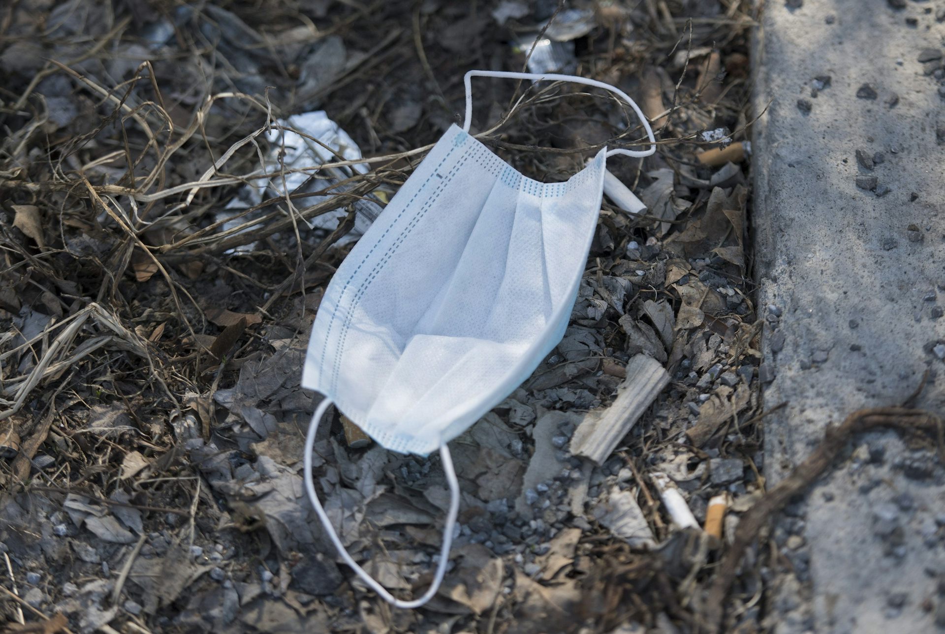 Un masque jeté dans une rue de Montréal, le samedi 25 avril 2020, alors que les cas de COVID-19 augmentent au Canada et dans le monde entier.