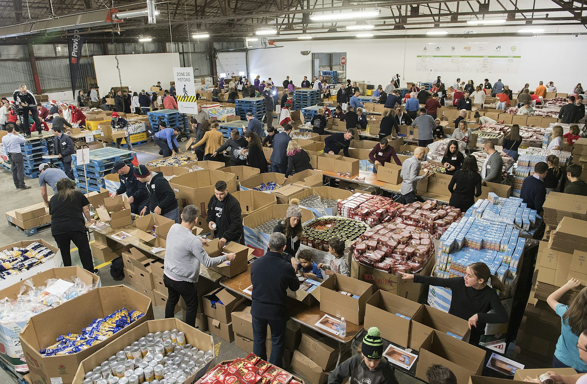 Des bénévoles placent des denrées alimentaires dans des boîtes, à Moisson Montréal, le 7 décembre 2019. Les fondations philanthropiques détiennent d'importants capitaux et il est essentiel qu'ils les investissement pour remplir leurs missions.