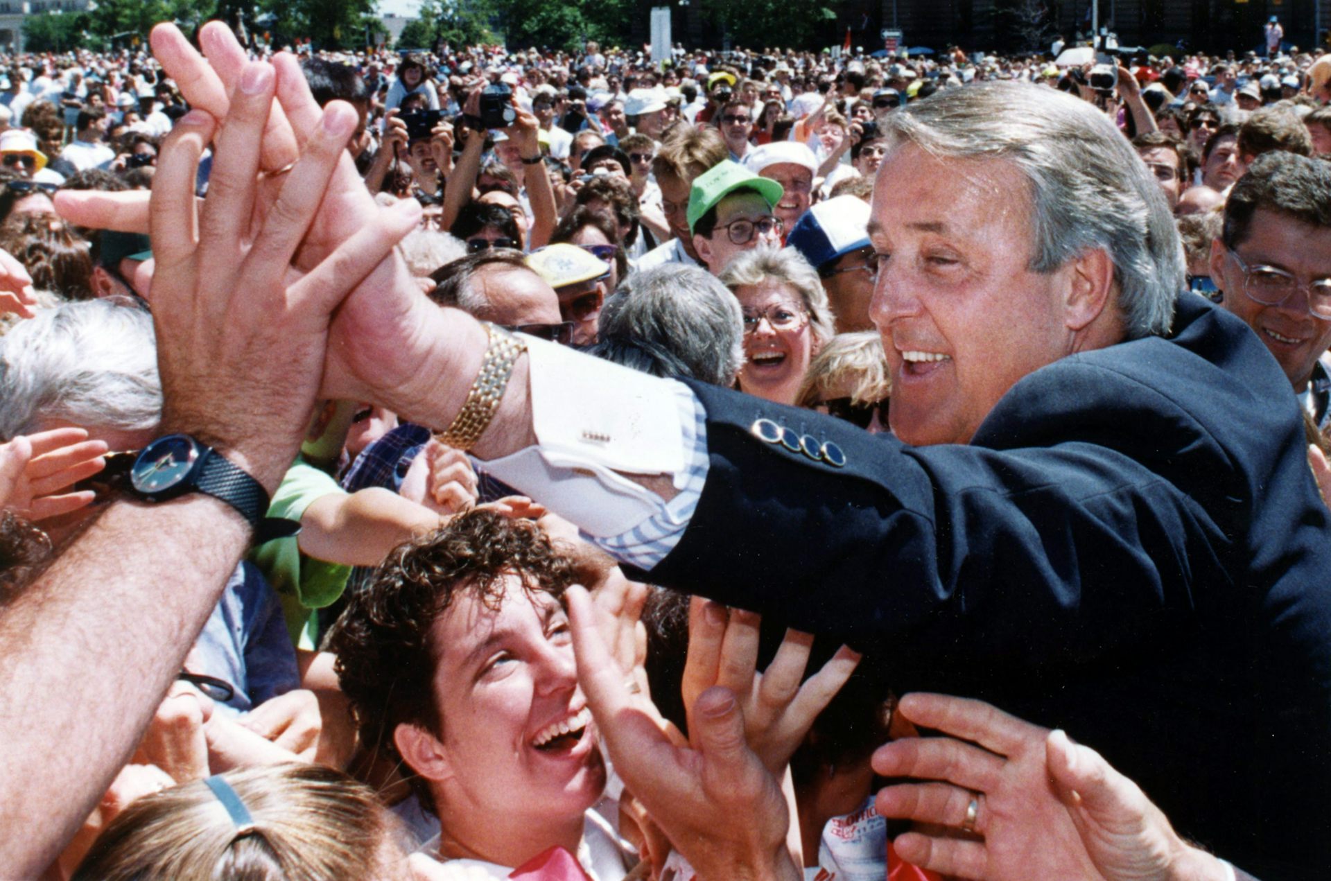 Brian Mulroney salue la foule lors de la fête du Canada, sur la colline du Parlement, en 1991.