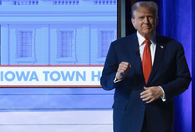 Republican presidential candidate Donald Trump appears at a Fox News town hall in Des Moines, Iowa on Jan. 10, 2024.
