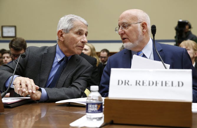 Anthony Fauci, left, director of the National Institute of Allergy and Infectious Diseases, speaks with Robert Redfield, director of the Centers for Disease Control and Prevention, before testifying at a congressional hearing in March. Fauci has had a higher public profile during the coronavirus pandemic.
