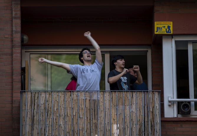 People dance on their balcony in Barcelona, Spain, on April 25, 2020, as the lockdown to combat the spread of coronavirus continues.