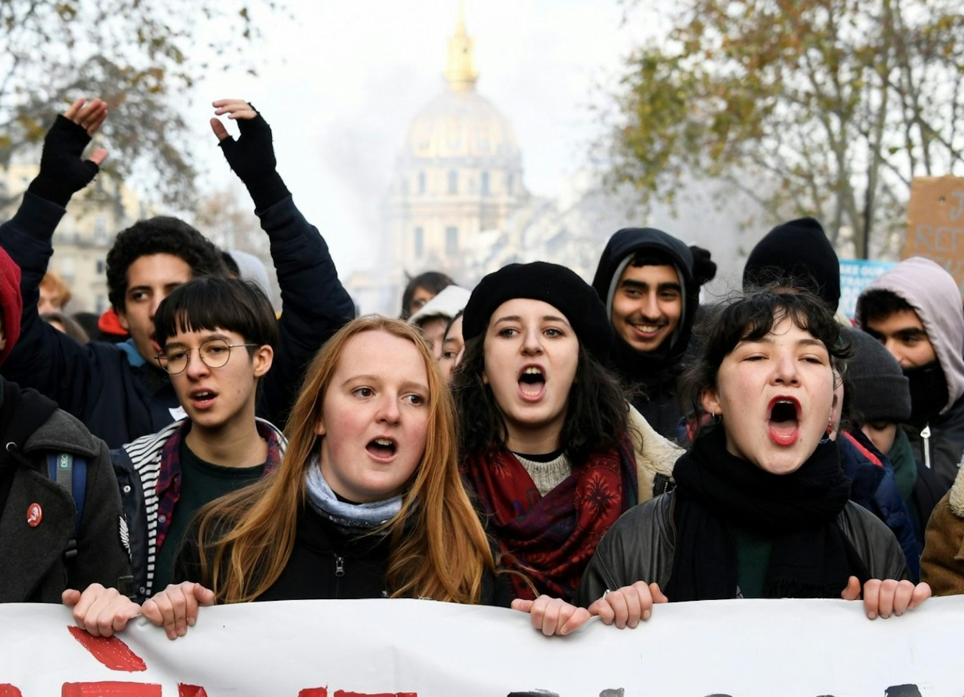 Des jeunes marchent derrière une banderole lors d'une manifestation à Paris contre la réforme du système de retraite.