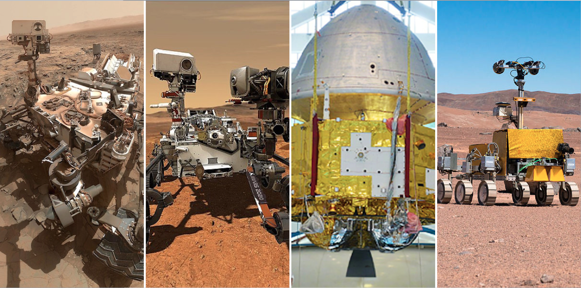Les rovers martiens Curiosity, Perseverance, Zhurong et Rosalind Franklin. Les deux premiers, de la NASA, sont posés sur la planète rouge. Zhurong est le rover de la mission chinoise Tianwen-1 et vient de se poser, le samedi 15 mai 2021. Rosalind Franklin, russo-européenne, n’a pas encore quitté la Terre – ici le prototype du rover est en phase de test dans le désert de l’Atacama.