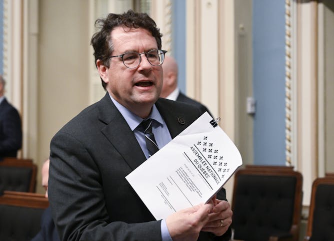 Le ministre de l'Éducation du Québec, Bernard Drainville, dépose son nouveau projet de loi visant à réformer le système d'éducation, le 4 mai 2023, à l'Assemblée nationale.